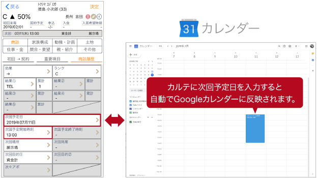 LASHINBANdbでは「GoogleカレンダーAPI」を利用することにより、顧客とのアポイントや上長への 同席依頼予定をGoogleカレンダーと同期することで、移動の多い営業パーソンの円滑なスケジュール管理が行える。