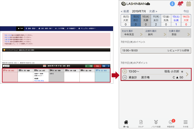 これまではLASHINBANdbの予定表はパソコンでしか確認できなかったがスマートフォン対応でいつでも確認できます。また、Googleカレンダーと連携させる事により、社内イベントや研修予定等も共有させる事が可能に!
