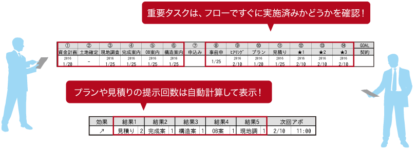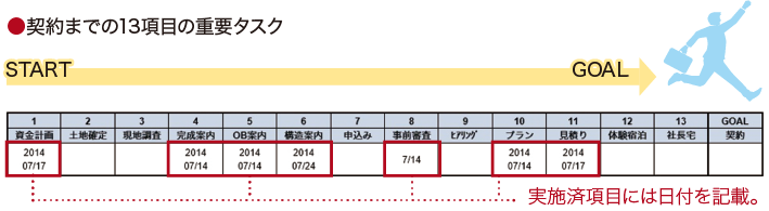 ①資金計画②土地確定③現地調査④完成案内⑤OB案内⑥構造案内⑦申込み⑧事前審査⑨ヒアリング⑩プラン⑪見積り⑫体験宿泊⑬★(企業側で自由に設定)と契約までの重要タスクの進捗が一目で確認できる。