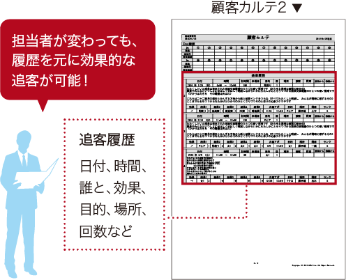 「いつ」「誰と」「どこで」「何を」「何分ぐらい」実施したか等、状況をLASHINBAN内に登録することで、カルテの最新(最終)状況を残し、別担当者が架電・訪問する際の既決済を防止する。
