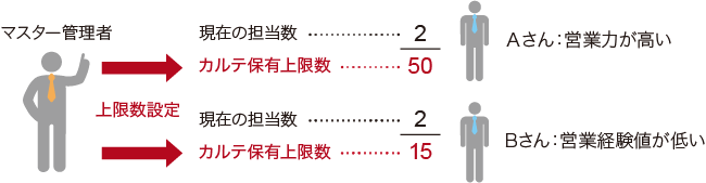 LASHINBANdbでは、担当として持てるカルテの上限数を設定ができる。それにより、担当者が適正なカルテを保持するかたちになるので、追客が出来ずにLBD*になる名簿を減らすことにも繋がる。 *LBD(Lose By Default)→ 不戦敗。いつのまにか他決。