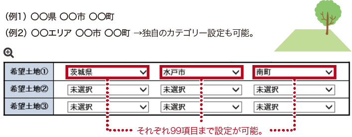 顧客カルテ内に、希望土地エリアをプルダウンで登録が可能。エリア検索は第3カテゴリーまで登録できる。