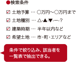 顧客カルテに登録された希望土地エリアから逆引きで一発検索が可能。土地情報を元にした該当者検索により、タイムリーな土地紹介ができる。